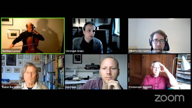 Eine oder eine weitere gemeinsame Ebene, nach der Christoph Grube fragte, ließ sich zwischen Gedicht und Musik dennoch finden: so wie das wiederholte Lesen das Verständnis eines Textes verstärke, führte auch das wiederholte Spielen zu einem Zugewinn. Das Verständnis offenbare dann Details, die man vorher übersehen habe, gleichzeitig besteht aber die Gefahr, aus dem (Selbst)verständnis heraus manches zu übersehen. In jedem Fall setze sich der Prozeß fort. Insofern bedauerte es Matthias Lorenz ein wenig, »Cello-Einsatz« schon vor ein paar Jahren auf CD aufgenommen zu haben – heute würde er manche Passagen anders spielen (in einigen Jahren würde sich das aber natürlich erneut ändern).