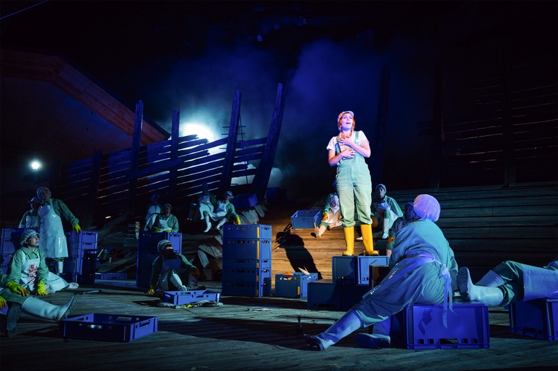 Ekkehard Klemm (musikalische Leitung) läßt die Dresdner Fassung des Holländers mit der Elbland Philharmonie Sachsen in Rathen wirkmächtig aufbrausen. Die Sängerinnen und Sänger nutzen den Spielraum, ihre Figuren zu gestalten, ihnen mehr Tiefe zu geben – oder aber deren platte Überheblichkeit zu zeigen, wie Michael Königs Daland, der sich erst mit Geld wäscht und später an der Tafel auf den höchsten Platz setzt – in der Tat scheint er aber wenig hellsichtig und verschachert die Tochter billig. Die, Senta, trumpft derweil emotional mehr und mehr auf. Ihre Ballade feuerte sie geschmeidig gegen den Chor der Spinnerinnen (bei Kai Anne Schuhmacher derweil sind es Facharbeiterinnen, die in einer Lagerhalle Fisch und Fischstäbchen sortieren). Solche Gegensätze, und gerade bei Beteiligung der Chöre, fallen immer wieder auf und tragen wesentlich zum geisterhaften Finale bei. Die von allen Seiten bedrängte Senta faßt schließlich einen eigenen Entschluß …