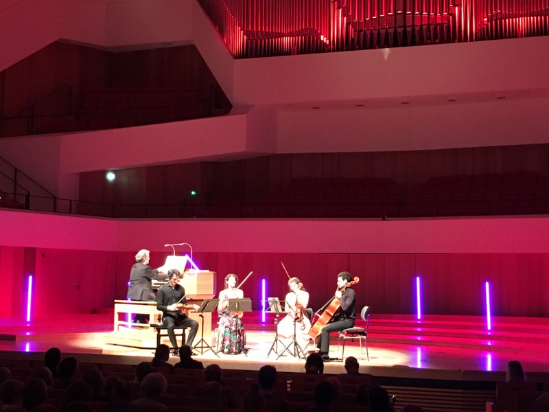 Nachdem am Sonnabend gerade der »Ring« mit Marek Janowski und der »Götterdämmerung« zu Ende gegangen war, sorgte Thierry Escaich quasi für einen Neuanfang – »Sonnenaufgang« war sein Programm angekündigt. Und er kam nicht allein – das ebenfalls aus Paris stammende russisch-französische Quatuor Tchalik begleitete den Organisten, interessanterweise den ganzen Abend über. Anders als in manchen Programmen der Sinfoniekonzerte in den letzten Jahren, welche die Kontrapunkte zwischen zum Beispiel Beethoven-Sinfonie und Streichquartett setzten, spielten Thierry Escaich sowie Gabriel und Louise (Violinen), Sarah (Viola) und Marc Tchalik (Violoncello) fast alle Stücke gemeinsam als Quintett. Fast, denn nach der ersten Orgelimprovisation, eigentlich mehr ein Intro, erklang quasi ein Quartett bzw. ein Quintett ohne Viola. Wolfgang Amadé Mozarts Sonate für Orgel und Streicher (KV 336) läßt sie aus bzw. überträgt ihren Part der Orgel – interessant vor dem Hintergrund, daß Mozart selbst gern Bratsche spielte und bei einer Aufführung wohl (stellvertretend) an der Orgel saß. Die Balance war bereits hier vortrefflich, bei Adagio und Fuge (KV 546), nun in regelrechter Streichquartettformation, nicht minder. Präzise, aber auch geradezu mystisch klang das Quatuor Tchalik und machte so auf sich aufmerksam – die feine Quartettkultur ist ihm gegeben, für Kammerabende sei der Name also vorgemerkt!