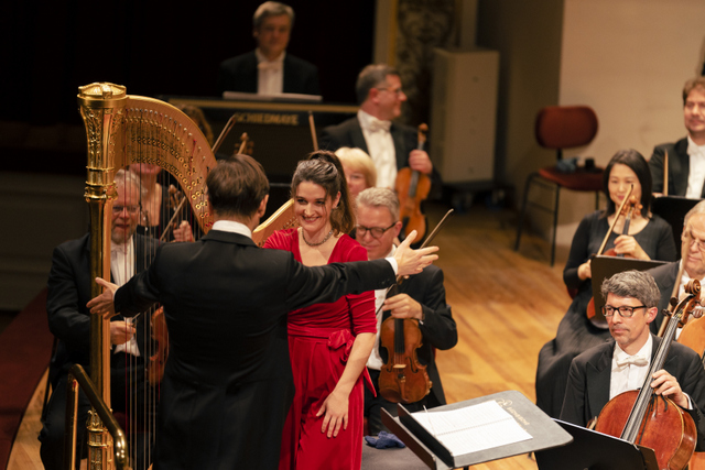 Geglückte musikalische Partnerschaft: Johanna Schellenberger (Harfe) und Mihhail Gerts (Dirigent), Sächsische Staatskapelle Dresden, Photo: Sächsische Staatskapelle Dresden, © Markenfotografie