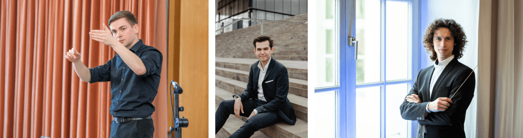 Die drei Dirigenten des Abends: Benedikt Kantert, Tim Fluch und Alexander Sidoruk, Photos: HfM, © Klaus-Dieter Brühl (Benedikt Kantert) und Anna Werner (Tim Fluch)
