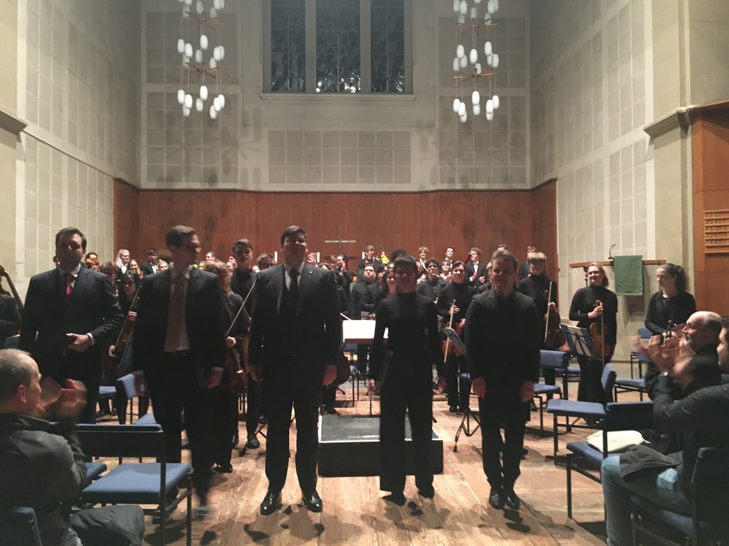 Derartige Hinwendung gab es auch bei Mozart. Zum Solistenquartett gehörten außerdem Jonathan Mayenschein (Alt), András Adamik (Tenor) und Gerry Zimmermann (Baß), die teilweise bereits bei Mendelssohn solistisch unterstützt hatten. Toll war, wie Richard Stier die Blechbläser zu einem Chor zusammenfaßte, so daß diese wie eine fünfte Solistenstimme (oder eben ein zweiter Chor) wirkten, immer wieder gaben sie den gesungenen Worten einen Nachhall oder (wieder positiv gemeint) Klangschatten.