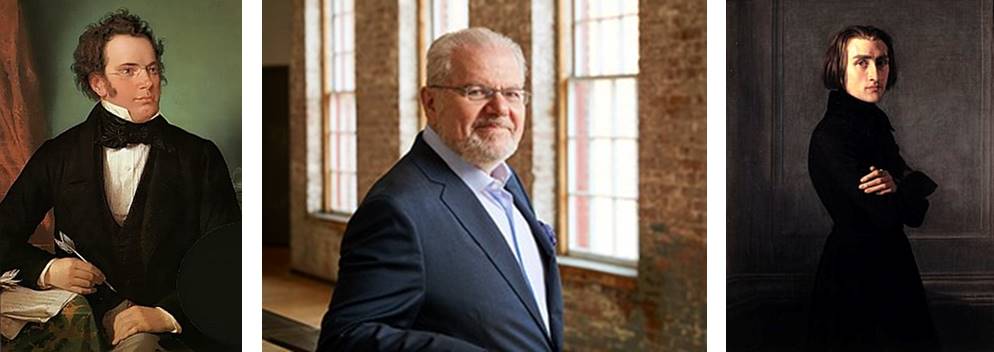 Wilhelm August Rieder: Franz Schubert, Portrait nach einer Aquarellvorlage (Bildquelle: Wikimedia commons), Emanuel Ax (Photo: DMF, © Nigel Parry), Henri Lehmann: Portrait von Franz Liszt (Bildquelle: Wikimedia commons)