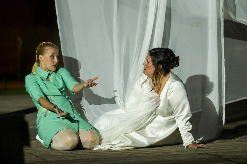 Szenen statt Regenabbruch: Ensemble und Chor in Regenpelerinen am Premierenfreitag, Photo: NMB