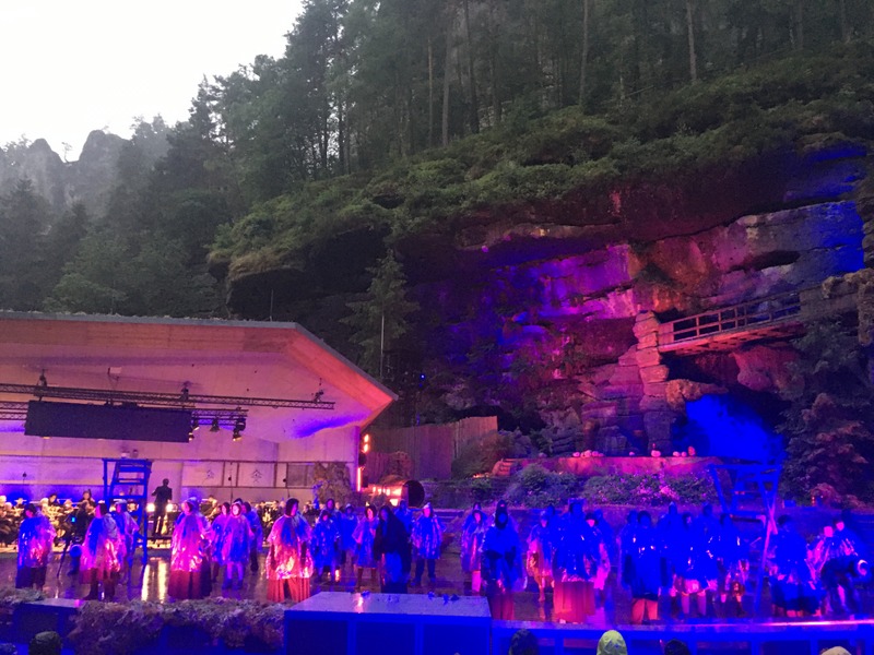 Wer ausharrte, wurde mit dem Höhepunkt, dem Gießen der Freikugeln in der Wolfsschlucht belohnt. Feuer, Rauch, Wolfsgeheul und unheimlich glimmendes Rot, Grün und Blau machten daraus ein so effektvolles wie fabelhaftes Spektakel. Am Ende wurden (mit Unterbrechungen) fast zwei Stunden Oper geboten, inclusive Pferden und Feuerwerk. Mehr Glück hatten die Besucher der eigentlich zweiten Vorstellung, die am Sonnabend unverhofft zur nachgeholten Premiere bei bestem Wetter kamen. Da bleibt den Premierengästen nur eines: bei nächster Gelegenheit noch einmal nach Rathen zu fahren.