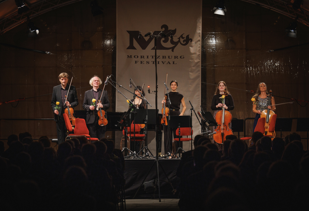 Spitzensextett: Ulrich Eichenauer, Kai Vogler, Mira Wang, Sindy Mohamed, Margarethe Vogler und Sandra Lied Haga spielten Brahms, Photo: Moritzburg Festival, © Oliver Killig