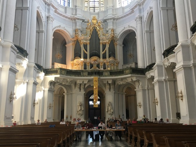 Zweite Runde des Orgelwettbewerbs in der Dresdner Hofkirche. Von unten sieht man nicht, wer spielt. Jury von links: Martin Strohäcker, Pieter van Dijk, Albrecht Koch (Künstlerischer Leiter der Silbermann-Tage), Jean-Baptiste Robin, Els Biesemans, Bine Katrine Bryndorf (Jury-Vorsitzende), David Franke. Photo: NMB