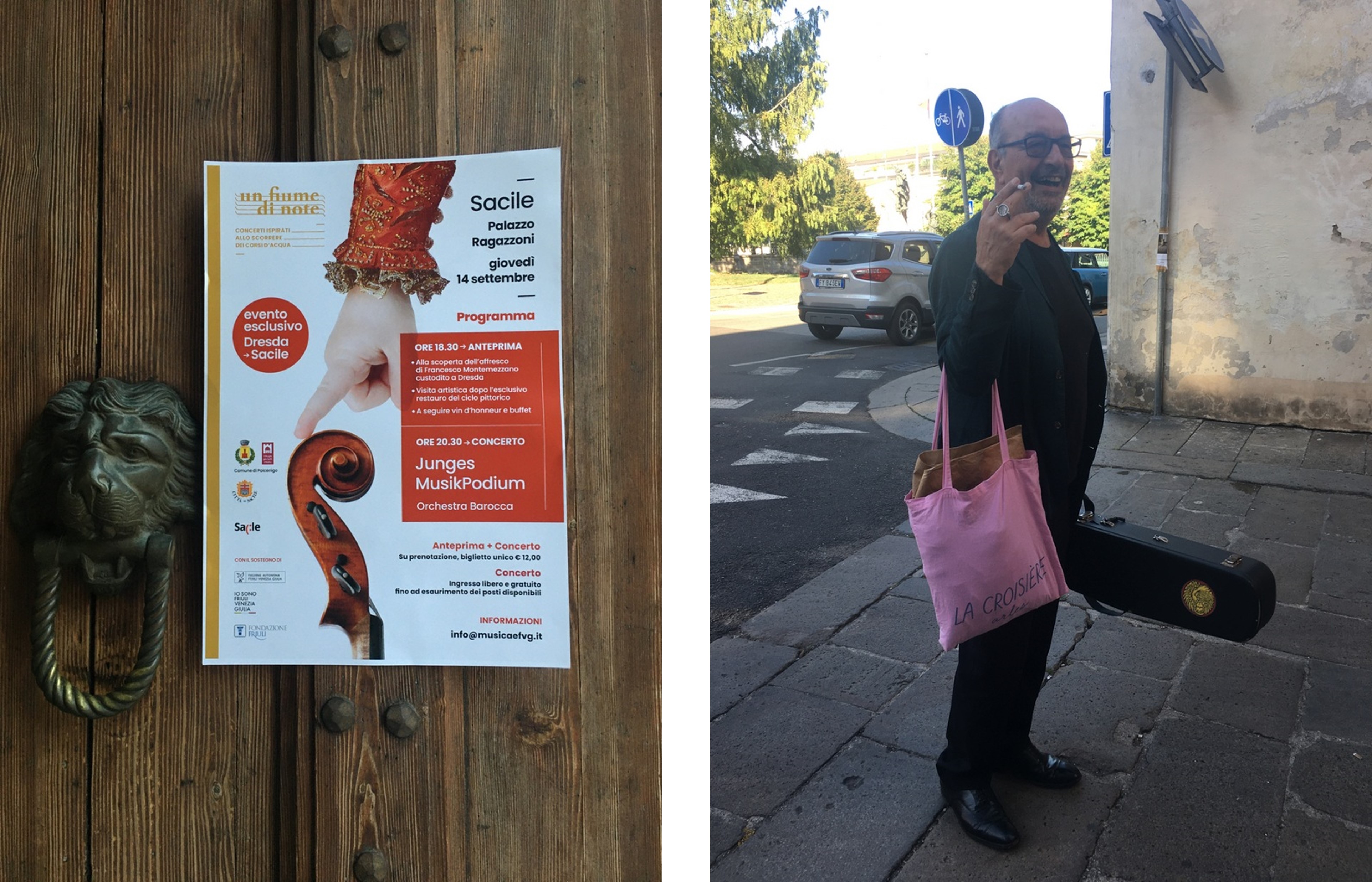 Konzertplakat in Sacile. Der Palazzo Ragazzoni war der zweite Auftrittsort des JMP. Rechts: Ivano Zananghi hat sich für seine Noten einen schicken rosa Beutel geborgt – steht ihm doch, oder? Photos: NMB