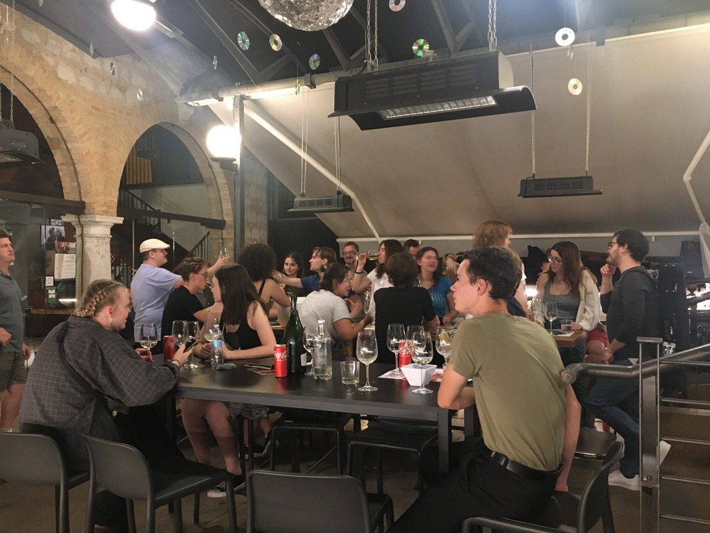 Besuch in der Pizzeria in Sacile nach dem Konzert. Mittendrin Bratschist Andrea Fazio (weiße Mütze) als intrattenitore (Animateur), Photo: NMB