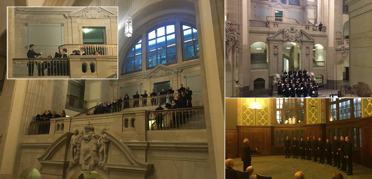 Das Vocal Concert Dresden in der Kuppelhalle der Sächsischen Staatskanzlei sowie im Großen Sitzungssaal (unten rechts), links oben: Sopranstimmen des Kreuzchores mit Richard Stier, Photos: NMB