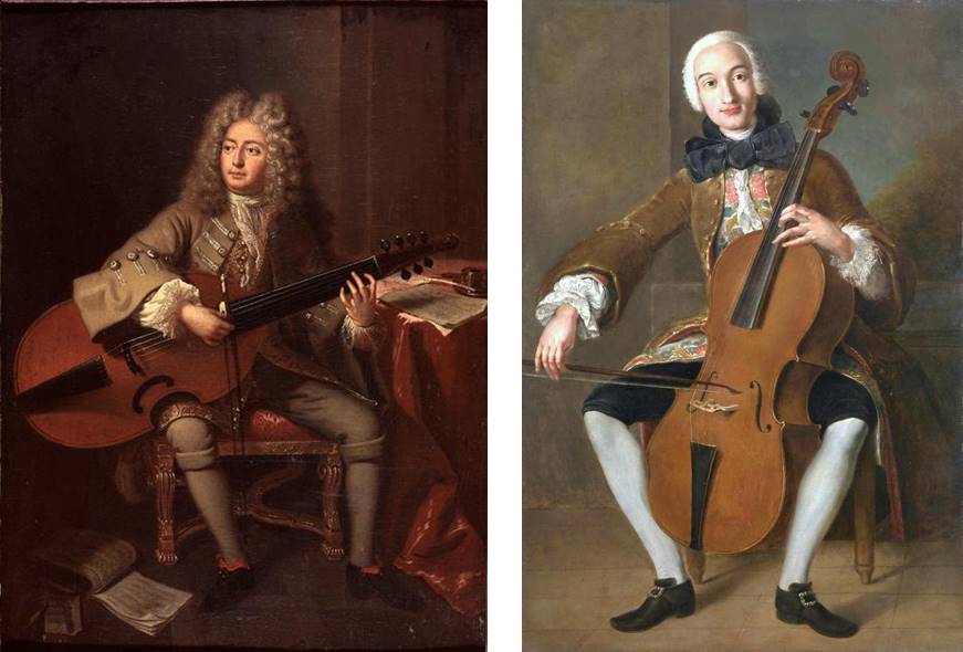 Marin Marais mit der Viola da Gamba (Gemälde von André Bouys, 1704), Luigi Boccherini mit dem Violoncello (Pompeo Batoni, ca. 1764 … 1767), Bildquellen: Wikimedia commons