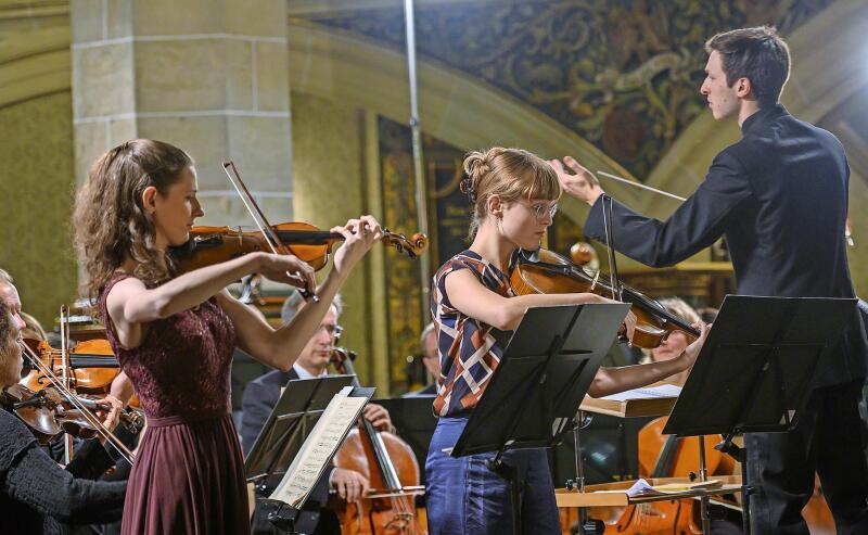 Wer Praetorius heißt und Musiker ist, trägt vielleicht eine ähnliche Bürde wie Franz Xaver Mozart. Der junge Dirigent, Nachwuchspreisträger und ab kommenden Jahr Assistent des GMD Sir Donald Runnicles an der Deutschen Oper Berlin, nahm es weder schwer noch leicht. Wolfgang Amadé Mozarts Sinfonia concertante für Violine, Viola und Orchester Es-Dur (KV 364) mit Helene Freytag (Violine) und Tabea Ockert (Viola), die beide gerade erst am Beginn ihres Studiums stehen, schimmerte im Vergleich zur eben gehörten Sinfonia viel dunkler, gefiel aber vom ersten Moment mit dem eleganten, fein abgestimmten Paarlauf der Solistinnen. Ihre musikalisch-rhetorischen Figuren waren einerseits synchron abgestimmt, schienen in den Oktavierungen und Abwandlungen aber bereits wie Variationen – solche folgten nach der Pause. Zunächst durfte man den sinnlichen Ton der beiden Instrumente vergleichen, dem das Orchester mit ebenso schönen Farben (an diesem Abend fabelhafte Hörner!) gegenüberstand.