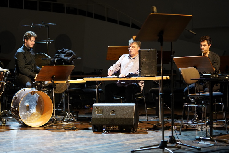 Kein Wunder also, wenn der Anlaß viele Spieler (im wahrsten Sinn des Wortes) auf den Plan rief. Kollege Mark Andre hatte in Abwesenheit einen Videobeitrag (Schumanns »Der Dichter spricht«) gesandt, sonst stand die Klassische Gegenwartsmusik im Mittelpunkt. Neben Meilensteinen der Moderne, teils schon zum Klassiker gereift, gehörten sechs (!) Uraufführungen zum Programm. Gerhard Stäbler (»Zwischenräume«), Franz Martin Olbrisch (flow IV für Jörn Peter«), Alberto Arroyo (»JP 49 + 11«) sowie Nikolaus Kuhn (»Ruh aus in deinem Plural«) hatten neue Stücke, vokal und instrumental (oder beides) für den Anlaß geschrieben und erkundeten darin die Klangräume unserer Gegenwart. Manos Tsangaris erkundete improvisierend »das Objekt« Jörn Peter Hiekel in »der hiekel-auslöser … und seine zeit« humoristisch und an Loriot erinnernd, den Manuel Gervink bereits in seinem Wortbeitrag bedacht hatte (mit Bezug auf einen der Sketche, wonach man mit einem »Jodeldiplom« etwas für die Zukunft habe [Loriot], während die Neue Musik beständig neu erkämpft werden will [Gervink]). Shen Hou fügte dem ein eigenes Gedicht (»JPH-60«, deutsch und chinesisch) hinzu.