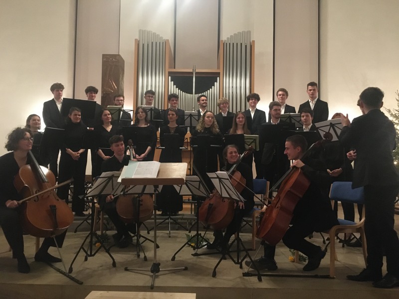 Richard Stier hatte sich für eine Dreiteilung des Programms entschieden, die thematisch (ungefähr) Neujahr, Weihnachten und noch einmal das neue Jahr umkreiste. Davor bzw. zwischen den Teilen spielten Johann Eilrich, Paul Garnier, Franziska Griese und Jula Murbach auf ihren Violoncelli im Quartett. Vier Celli eröffnen eine ganz eigene Klangwelt, die sehr bannen, deren spezieller Effekt aber nach einiger Zeit aber nachlassen kann. Insofern war es schön und richtig, daß sich Wilhelm Fitzenhagens Ave Maria (Opus 41, Beginn), Guillaume Pâques Souvenir de Curis und das Notturno aus Felix Mendelssohns Schauspielmusik »Ein Sommernachtstraum« (Bearbeitung für vier Violoncelli: Wilfried Rehm) mit dem A-cappella-Gesang abwechselte, ein zu großer Schwerpunkt vermieden wurde. Als harmonische oder kontemplative Zwischenmusik waren die Quartettstücke eine Abwechslung, Guillaume Pâques Souvenir de Curis ähnelte einem fernen Gesang. Darüber hinaus begleiteten die vier manche der Lieder oder übernahmen ein Vorspiel (bzw. beides), wie in Michael Praetorius‘ »Der Morgenstern ist aufgedrungen«. Gerade die romantischen Kompositionen von Josef Gabriel Rheinberger (»Mit dir begonnen sei das neue Jahr«) oder Felix Mendelssohn (»Wer bis an das Ende beharrt«) erfuhren außerdem einen dramaturgischen oder gestalterischen Verlauf (ähnlich eines Organisten, der die Strophen eines Kirchenliedes unterschiedlich registriert).