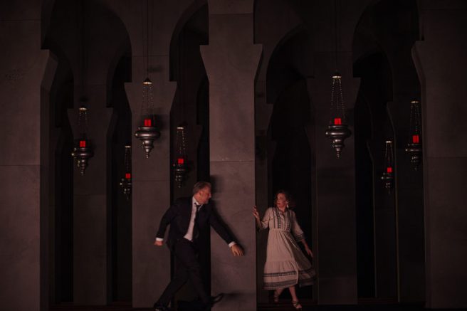 Das reiche Bühnenbild mit Maurischen Bögen und Öllämpchen wird niemals vordergründig und bebildert das Geschehen geradezu symbiotisch – offenbar sind Stück und Regie gemeinsam gewachsen. So bleibt die Bühne vor allem der Aktionsraum für den hervorragenden Staatsopernchor (Einstudierung: Jonathan Becker) und die Solisten. Markus Marquardt als Manrique, Graf von Lara, eigentlich ein Vertrauter Alfonsos, ist in seiner Unzufriedenheit über den einstigen Zögling hin- und hergerissen: dem König treu, hat sein Schüler doch das Ziel verfehlt. Manrique stellt sich schließlich an die Seite der Königin bzw. der Macht. Sein Sohn Don Garceran, von Aaron Pegram dargestellt, ist ein Bote und Indikator am Scheideweg: Wenn er dem König in markanter Schärfe sagt »So sind die Regeln!«, belehrt er seinen Herrn nicht, sondern macht ihm den Ernst der Lage unmißverständlich deutlich. Unklar bleibt, warum der König seine Rolle und die Beziehung zu seinen Untergebenen nicht hinterfragt – sie morden schließlich nicht nur Rahel, die feindliche Jüdin, sondern plündern sein Haus (was die Regie aber mit einem Vorhang verdeckt).