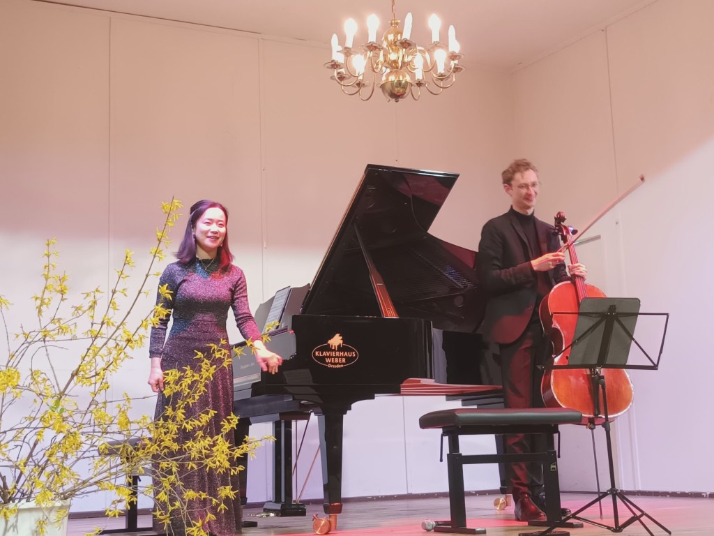 Gestern im Gemeindesaal der Christuskirche Strehlen durfte sich Mitveranstalter Matthias Wilde, Cellist der Sächsischen Staatskapelle Dresden, besonders darüber freuen, einen Orchesterkollegen begrüßen zu können. Und das war weit mehr als ein Freundschaftsbesuch – Sebastian Fritsch ist Konzertmeister der Violoncellogruppe der Sächsischen Staatskapelle Dresden und hat bereits zahlreiche namhafte Preise gewonnen. Naoko Sonoda, die als Klavierpartnerin auftrat, ist eine nicht weniger ausgewiesene Expertin, hat sie sich doch gerade als Kammermusikerin einen Namen gemacht und ist explizit als Begleiterin für Cellisten gefragt.
