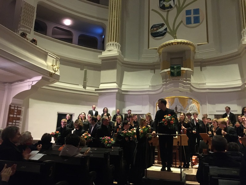 Die Geschlossenheit des Chores beeindruckte, immerhin an die 30 Sängerinnen und Sänger umfaßt er. Dabei ist die Besetzung noch nicht permanent, das heißt die Teilnehmer bereiten sich dezidiert auf die Projekte vor (anders als Chöre mit wöchentlich regelmäßigen Proben). Ganz offensichtlich zielt Richard Stier nicht auf den Ausdruck eines Kammerchores, sondern strebt einen großen Chorklang bzw. ein volles »Plenum« an. Nicht weniger ausgefeilt setzte er das Instrumentalensemble ein, daß mit an die zwanzig Musikern incl. Gambe, Flöten und Oboen solo wie im Duo, ebenso reich besetzt war und es erlaubte, noch den Basso continuo unterschiedlich zu färben.