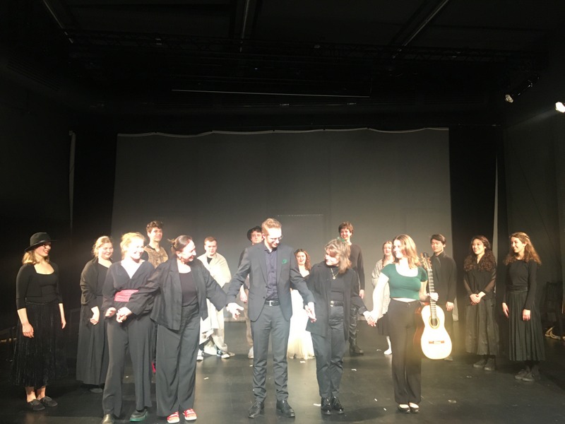Die Probebühne erwies sich als passender Aktionsraum, der sich mit Schattenspielen und wenigen Requisiten beleben ließ (Clarissa Kanske / Regieassistenz hatte im Herbst Henry Purcells »Dido und Aeneas« mit der Lehramtsklasse in Szene gesetzt). Und natürlich durfte gelacht werden, wenn sich etwa zu den Hauptfiguren ein Partner als Rosinante (Clara Bergert) bzw. Esel (Mykola Piddubnyk) hinzugesellte. Für einige Szenen (Sancho Panza: »Der Mann ist stets ein Opfer«) gab es verdienten Zwischenapplaus. Am Ende blieb offen, ob Don Quichotte Dulcinea je getroffen oder nur von ihr geträumt hatte.