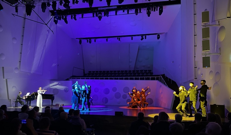 Den zauberischsten Effekt gab es vielleicht im ersten Bild mit Teilnehmern der Heilpädagogischen Schule Bonnewitz. Quallenwesen hingen von der Decke, Projektionen schufen Unterwasserwelten. Die Darsteller und Künstler, teilweise mit Handicaps belastet (etwa im Rollstuhl sitzend) tauchten mit Bewegung und Artikulation regelrecht in diese Welt ein, vor allem: sie wurden, so unterschiedlich und individuell sie waren, als Gruppe eine Wesenheit (womit Adele Pätz eine Entsprechung für Szymanowskis Stimmungen gefunden hat). Auch die Musik kam nicht nur von den beiden Spielerinnen (Hiroko Takafuji begleitete am Klavier), sondern wurde unter anderem mit Klanghölzern gespielt.