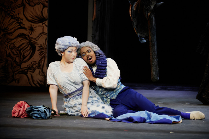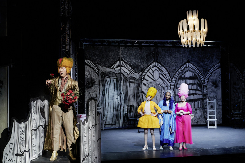 Das Ensemble vom Dienstag (Dahyun You / Sandrina, Anna Eisenmann / Serpetta, Kurumi Sueyoshi / Arminda, Max Hickl / Nardo, Sangyun Ha / Belfiore, Kyle Fearon-Wilson / Podestá und Alicja Bany / Ramiro) verschob manche Akzente im Vergleich zum Sonnabend – Kyle Fearon-Wilsons Podestá bestach mit einen Extra an Spielwitz und stimmlicher Vitalität, während die Arminda von Kurumi Sueyoshi deutlich damenhafter war. Wie ihre Kollegin der A-Serie verblüffte Sopranistin Dahyun You mit ihrem italienischen gusto in den Arien – wer hätte da eine Koreanerin vermutet?