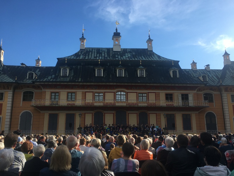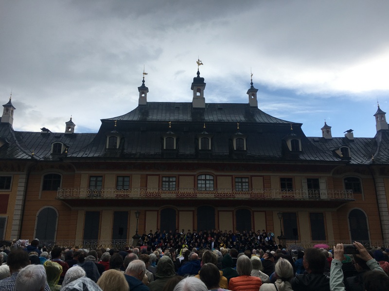 Nach der Vesper gab es das traditionelle Kurrendesingen am Trauportal und dort schon die eine oder andere Begegnung mit einem Stück, das am Sonntag im Rahmen der Serenade im Grünen im Pillnitzer Schloßpark erklang. Diese gehörte wie immer zu den Dresdner Musikfestspielen, doch zunächst sah es für das Freiluftkonzert gar nicht gut aus, sondern düster. Der Himmel zog sich wieder zu, Blitze zuckten, Donner grollte. Trotzdem begann der Kreuzchor frohen Mutes und mit frohen Herzen sein Programm. Zwar hatten die Jungs witterungsbedingt auf die traditionelle Chorkleidung verzichtet, ließen sich aber nicht einschüchtern – »wir sind zäh«, sagte Kreuzkantor Martin Lehmann.