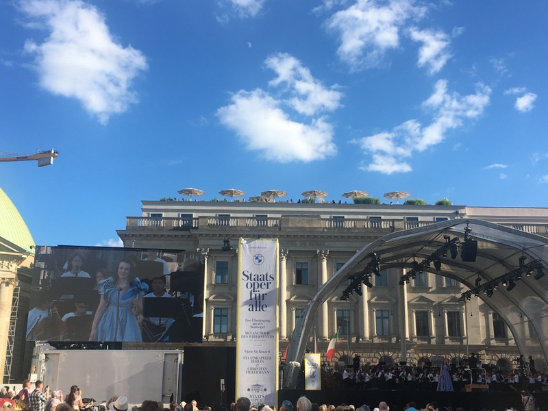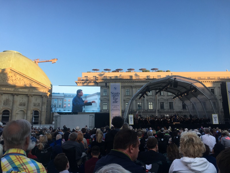 Etwas deutlicher zeichnete sich der Mond am Abend ab, als Christian Thielemann das Podium betrat. Natürlich ist die Berliner Innenstadt am Tage nicht mit der Nacht und dem Sonnenaufgang in den Alpen gleichzusetzen, doch kehrte im Publikum bald eine fast andächtige Stille ein, und spätestens mit dem »Aufstieg« war die Atmosphäre musikalisch bereitet. Zwar fühlte man sich auf dem Platz weiter weg von der Bühne als im Konzertsaal, dafür gab es aber eine große Leinwand und den Meister – wie auf dem Creutziger-Photo – direkt von vorn. Und dieses Bild zeigte einen entspannten Thielemann, der umsichtig bat und ordnete, vor allem aber mehr mit den Augen als mit den Händen zu kommunizieren und zu erklären schien.
