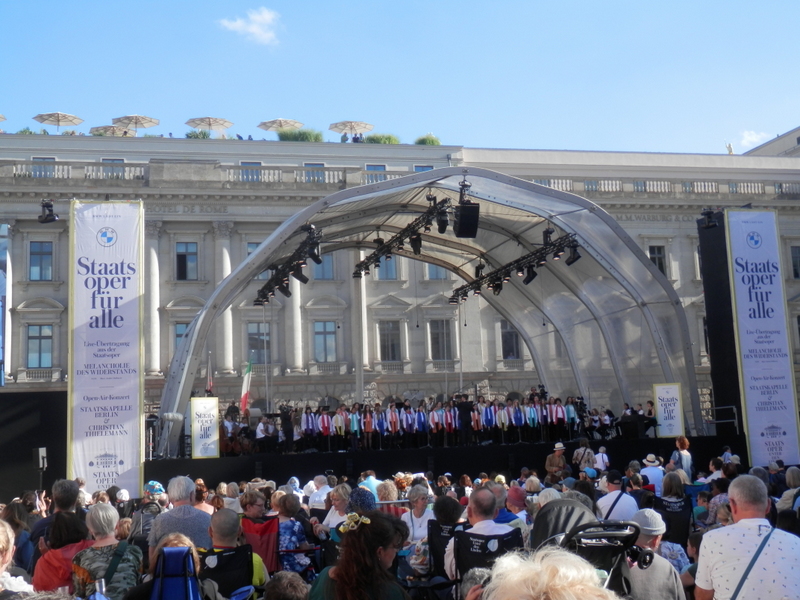 Am Sonnabend vor einer Woche konnte man dies [Bild] sogar »in echt« erleben – zum achtzehnten Mal hieß es auf dem August-Bebel-Platz »Oper für alle« mit Konzerten am Freitag und Sonnabend. Wobei am zweiten Tag das Opernkinderorchester (Leitung: Giuseppe Mentuccia) und der Kinderchor der Staatsoper Unter den Linden (vom an der HfM Dresden ausgebildeten Vinzenz Weissenburger geleitet) mehr als nur ein Vorprogramm waren. Der Kinderchor hatte nach Duke Ellingtons »It don’t mean a thing« mit »Das Unwetter« (mit einem neuen, eigenen Text auf Robert Schumanns Opus 29 Nr. 3, eigentlich »Zigeunerleben«) quasi die Elemente herausgefordert – das Wetter zeigte sich aber erfreulich milde. Das Opernkinderorchester, aus Kindern der Berliner Musikschulen zusammengesetzt, präsentierte vier der Slawischen Tänze Antonin Dvořáks. Zuvor hatte es Maria Kokareva, die zum Ensemble der Lindenoper gehört, im »Lied an den Mond« aus »Rusalka« begleitet. Während der angesungene bereits über den Nachmittagshimmel zog, lockte und circte die Sopranistin mit schlanker Stimme und aufwühlendem Vibrato – diese Rusalka machte neugierig! Neben der Nixe übernimmt Maria Kokareva in der kommenden Spielzeit den »Falken« in »Die Frau ohne Schatten«, Frasquita in »Carmen« und Susanna in »Figaro«.