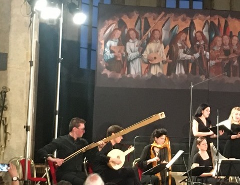 Dafür erlebte es eine große Abwechslung, denn nicht nur in den Stimmen gab es Soli und Duette, in der Begleitung wechselten sich Fidel, Psalter und Bläser, ein Organum (eine tragbare Orgel) und gotische Harfen (hierhin wechselte sogar Sopranistin Hana Blažíková) ab. Die Bläser (Trompete, Posaune) verwiesen in ihrer Bauform noch auf eine Zeit vor dem Chalumeau, wie es Katharina Bäuml spielt. Und haben Sie je eine Trumba marina, ein Trumscheit, erlebt? Wenigstens im Musikinstrumentemuseum? Hier gab es all das im Konzert! Und erstaunte mit seinen teils leicht schnarrenden Klängen. Mitunter mußte man schauen, wer bzw. WAS da gerade spielte und gerade Klang verursachte! Oder wieviel Instrumente, denn manche, wie die Harfe, konnten ihren Charakter ändern. Die wild tönende Trumba marina war allerdings leicht auszumachen. Das Instrument mit nur einer Saite, die ursprünglich gezupft wurde, aber auch gestrichen werden kann, entwickelt durch seinen eckigen Schalltrichter einen Ton, der wie geblasen klingt. Kein Wunder, daß sie am Ende bei der Zugabe noch einmal dazu geholt wurde. Bei der Trumba marina liegt sogar der genaue Ursprung im ungewissen. Daß es sich dabei um eine Tromba marina, eine Marinetrompete zur Signalgebung auf Schiffen gehandelt haben könnte, ist mehr eine Vermutung als daß diese Herkunft nachgewiesen wäre.