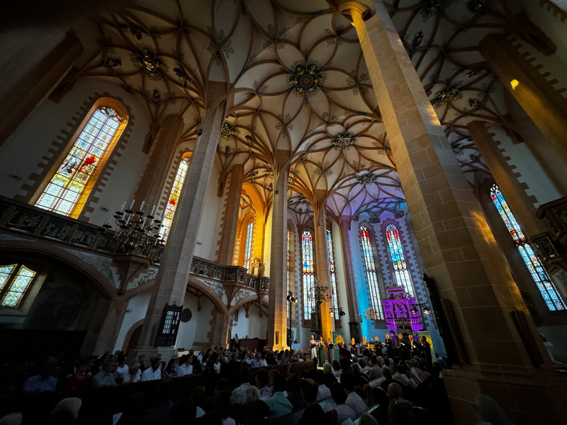 Nicht nur die Art der Lieder unterschied sich oder ihre Entstehungszeit, auch die Form der Darbietung. Dabei ist die Annenkirche mit ihrem Schlingrippengewölbe allein schon ein beeindruckender Ort, der noch dazu einen akustischem Reiz bietet – Gregorio Allegri Miserere war ein absoluter Höhepunkt! Das Ensemble konnte sich dabei mühelos umformen, in unterschiedliche Chöre (für Gregorianik oder Echo) aufteilen, einmal die Männer- oder Frauenstimmen allein klingen lassen. Das Ergebnis war in jedem Fall unvermindert ausdrucksstark!