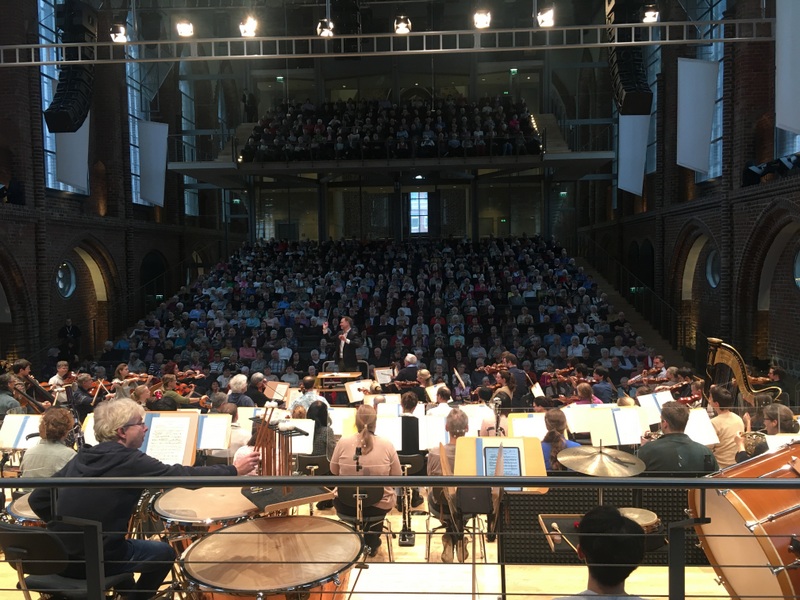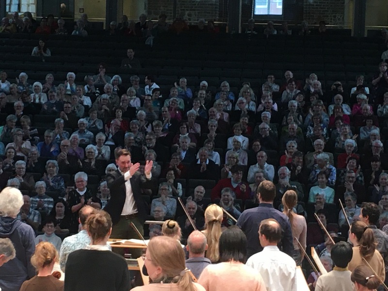 Im kurzen Pausengespräch erwischten wir Friederike Jahn (Konzertmeisterin 2. Violinen), die sich über den Ablauf und das Ergebnis freute, ebenso über das Dirigat. Der etwas andere Lärmpegel, die Unruhe, wenn doch einmal ein Handy klingelt, mache die Proben nicht anstrengender als ein Konzert. Das offene Konzept scheint also auch beim Orchester anzukommen. Und daß die Schulklassen (teilweise) für den zweiten Teil nicht blieben, ist in Ordnung – fürs erste Heranführen genügt ein Stück, für das ganze Programm ist später noch Zeit.