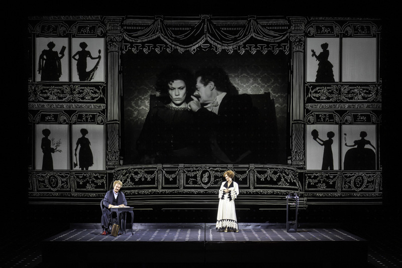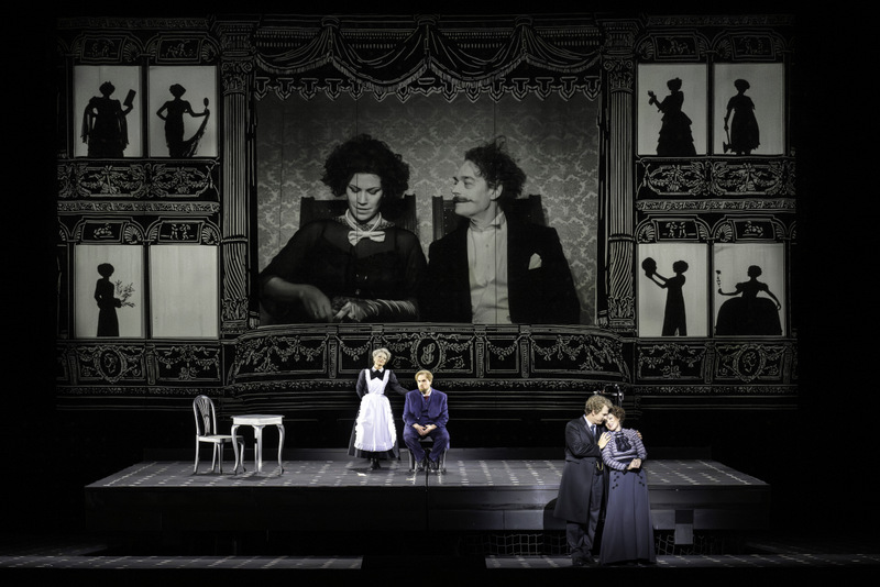 Das fröhliche Pasticcio geht aber noch weiter, denn Saskia Wunsch hat eine schon geniale Bühnenumgebung geschaffen. (Im elbseitigen Vestibül erzählt eine Graphic Novel von Joonas Sildre übrigens passend den Hintergrund zur Geschichte.) Das Dekor des Jugendstils bremst sie etwas aus, indem er nicht original bunt ist, sondern vor allem schwarz-weiß, in Scherenschnitten und Silhouetten. Die luftige Ausstattung läßt Bewegung und Kombinationen auf der Bühne zu, ohne daß die Szene verdeckt wird. Videos mit fingierten Rück- und Seitenblicken oder Traumsequenzen ergänzen dies. Und plötzlich wird aus der Semperoper, in deren Foyers einige Szenen gedreht sind (unter Beachtung der Richard-Strauss-Büste), beim Öffnen der Terrassentür die »Villa Strauss« …