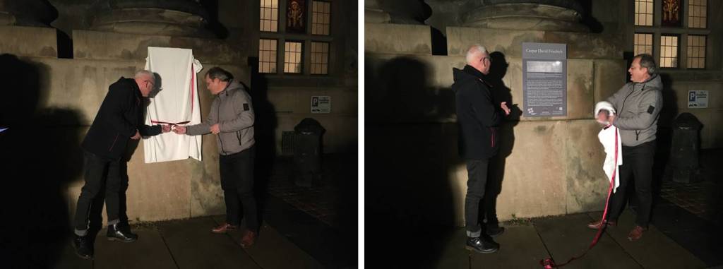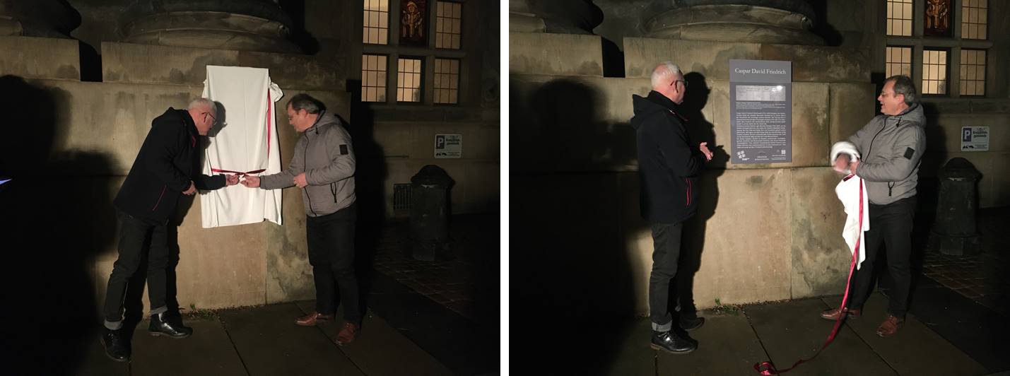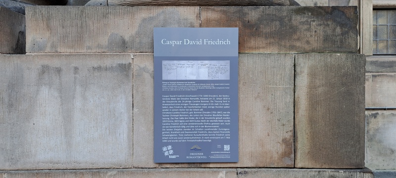 Man hatte es vielleicht ahnen können, daß der Dresdner Orgel-Zyklus, zumindest in der Kreuzkirche, romantischer wird. Auf der jüngsten Aufnahme von Kreuzorganist Holger Gehring mit Sebastian Pachel (Panflöte) strahlt ein Sonnenuntergang über Dresden, wie ihn Carl Gustav Carus um 1822 gemalt hat. Der Weg von Carus zu Caspar David Friedrich ist in dessen 250. Geburtstagsjahr kurz, in der Kreuzkirche ohnehin, denn hier heiratete der Maler am 21. Januar 1818 Caroline Bommer. Seit Mittwoch erinnert eine Tafel am Hochzeitsportal der Kreuzkirche an diesen Anlaß. Torsten Kulke vom Dresdner Romantik e. V. und Pfarrer Holger Milkau enthüllten sie vor dem Konzert – es ist der zweite von geplant fünfzehn solcher Punkte, die in Dresden einmal den Caspar-David-Friedrich-Weg markieren sollen.