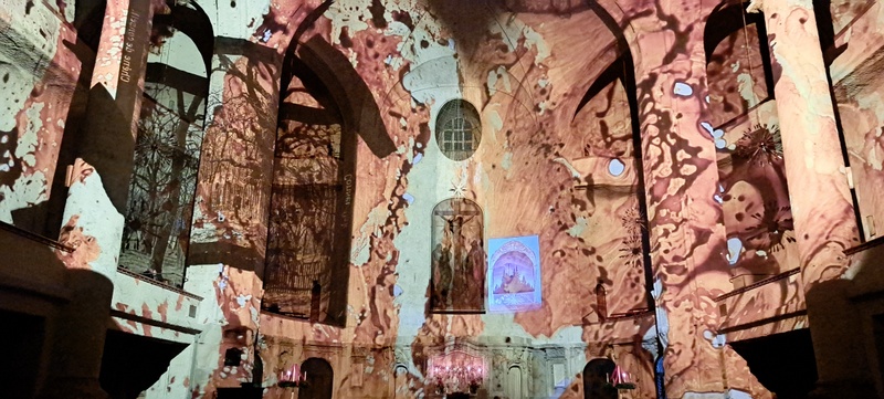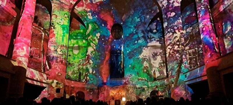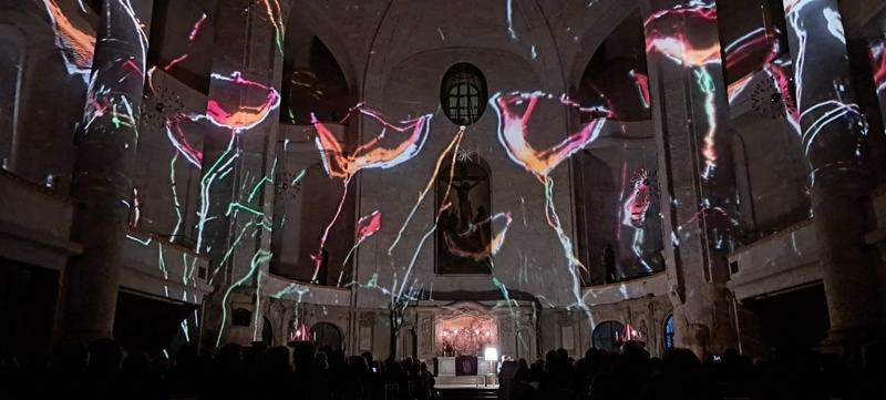 Mit sogenannten PANIs, Projektoren für übergroße Dias, und zwanzig gestalteten Glasplatten, die kombiniert werden konnten, verwandelte Andrea Hilger die Kreuzkirche in ein Gesamtkunstwerk, bei dem man manchmal nicht wußte, ob man mitten auf einer Bühne oder in einem Bühnenbild war – eine mythische Freskengrotte etwa? Denn nachdem Caspar David Friedrichs »Tetschener Altar« am Anfang einmal eingeblendet wurde, kehrten keine seiner Motive als erkennbare Zitate wieder. Vielmehr blieben die Bilder nun eher unkonkret und deutbar, ja phantastisch. Vögel, Tiere, Wesen oder einfach nur Augen konnte man in den projizierten Malereien entdecken, symbolhafte Hieroglyphen. Durch Farbverschiebungen und die dazu erklingende Musik änderte sich der Eindruck manchmal – waren die hellen Streifen nun Adern in einem Achat oder rinnendes Wasser?