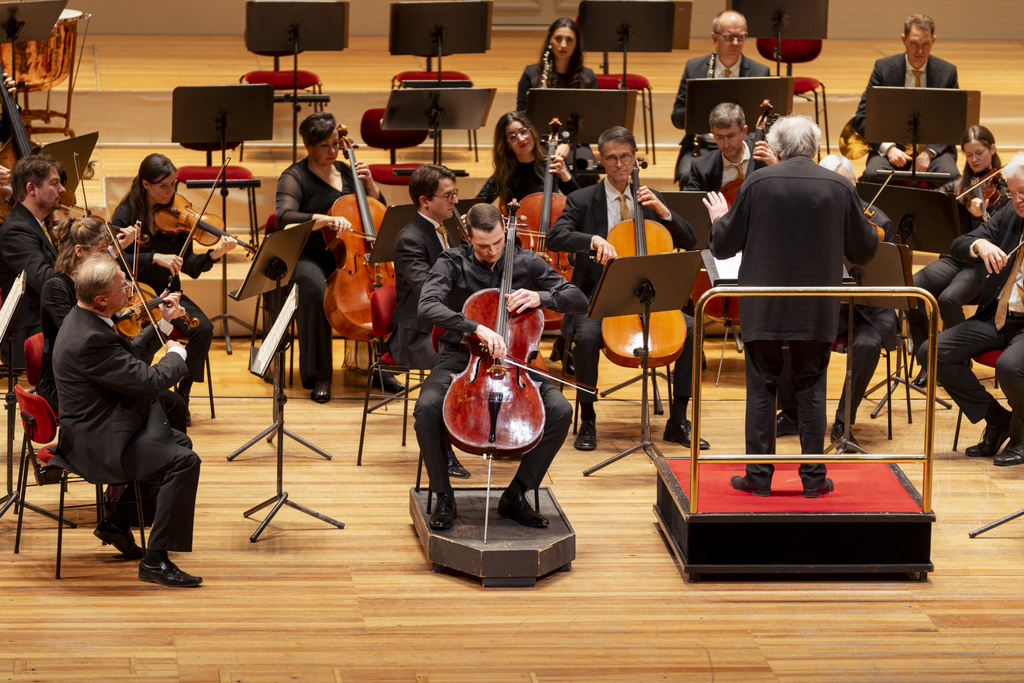 So ließ sich auch der dritte Satz in feiner Manier hören statt überbetonter Virtuosität – natürlich war sie gegeben. Doch im Gegenspiel von grazilem Gesang des Cellos und forciertem Orchester durften nun auch die Hörner glänzen. Friedrich Thieles Dank und Freude, in seiner Heimatstadt und mit seinem Orchester gespielt zu haben, die Blumen von seiner Cellogruppe zu bekommen, kam von Herzen. Die Zugabe, Bachs Courant d-Moll (BWV 1008) ebenso.