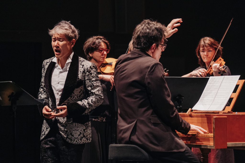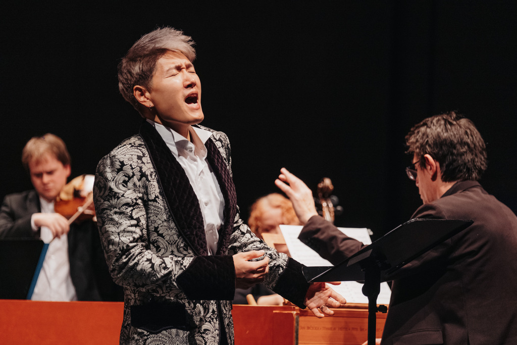 Das »Drama« blieb beim letzten Konzert des Collegium 1704 im Prager Kulturzentrum Vzlet für dieses Jahr gestern zum Glück auf den musikalischen Aspekt beschränkt, war dafür aber um so eindrucksvoller. Gleich in zwei Kantaten klagte Kangmin Justin Kim ^die »crudel« (Grausamkeit bzw. Grausame) an, am Beginn von Carl Heinrich Grauns »Apollo amante di Dafne«, Georg Friedrich Händels HWV 78 trägt sie sogar im Titel: »Ah! Crudel, nel pianti mio«. Den Countertenor hatten wir schon einmal in Dresden erlebt, als 2019 er im Rahmen der Musikbrücke Prag – Dresden an der konzertanten Aufführung von Antonio Vivaldis »Arsilda« (RV 700) beteiligt war. Damals schon war er eine optisch wie klanglich extravagante, eindrucksvolle Erscheinung! Doch Kim kann auch ganz sanfte, melancholische Töne anschlagen, erfuhren wir gestern aufs neue.