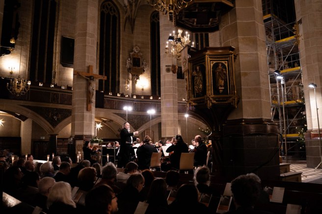 Am Vorabend des Holocaust-Gedenktages trafen sich die Neue Jüdische Kammerphilharmonie (NJK) mit ihrem Leiter Michael Hurshell und zahlreiche Vertreter aus Politik sowie der Gedenkstätte Pirna-Sonnenstein in der Stadtkirche Marien. Ein Gedenkanlaß mit gleichviel Musik- und Wortbeiträgen, der entsprechend viel Verbindendes zeigen sollte. Das begann mit den Musikern der NJK, die im Altarraum der Kirche spielten, in dem noch die Zeichen des christlichen Weihnachtsfestes (Bäume und Herrnhuter Sterne) leuchteten. In diesem Miteinander wurde der Konzerttitel »Die Musik nach Hause bringen« sozusagen sinnbildlich.