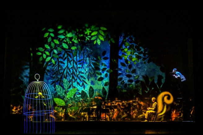 Für die schnellen Wechsel von Personen und Ort, aber auch, um den Tumult darzustellen, ohne wirklich etwas zu zerbrechen, hat sich das Inszenierungsteam (Konzept & Video: Grégoire Pont, Inszenierung: James Bonas, Bühne und Kostüme: Thibault Vancraenenbroeck, Licht: Christophe Chaupin, Videoeinrichtung: Xavier Boyer) ein geniales Konzept einfallen lassen, indem sie die Szenerie um die realen Personen vor allem durch Projektion über den Bühnenraum hinaus erstehen läßt. Das funktioniert erstaunlich genau bzw. synchron, sowohl den Ort, also die Position eines Solisten, als auch den Zeitpunkt betreffend. Auf diese Weise werden nicht nur Zimmer und Garten ausstaffiert, den Protagonisten wachsen Flügel oder sie werden in einen Käfig gesteckt, den man zwar sieht, der aber nur aus Licht besteht. Verblüffend, wenn man feststellt, daß fast alles nur Illusion ist, was man in der Ankündigung auf Bildern sah! Einziger Nachteil: Wenn sich zum Schluß alle beim Applaus verbeugen, haben es Eltern schwer, ihren Kindern zu erklären, wer was gespielt hat, denn die Solisten sind dann in ihrer grauen Kleidung kaum zu unterscheiden.