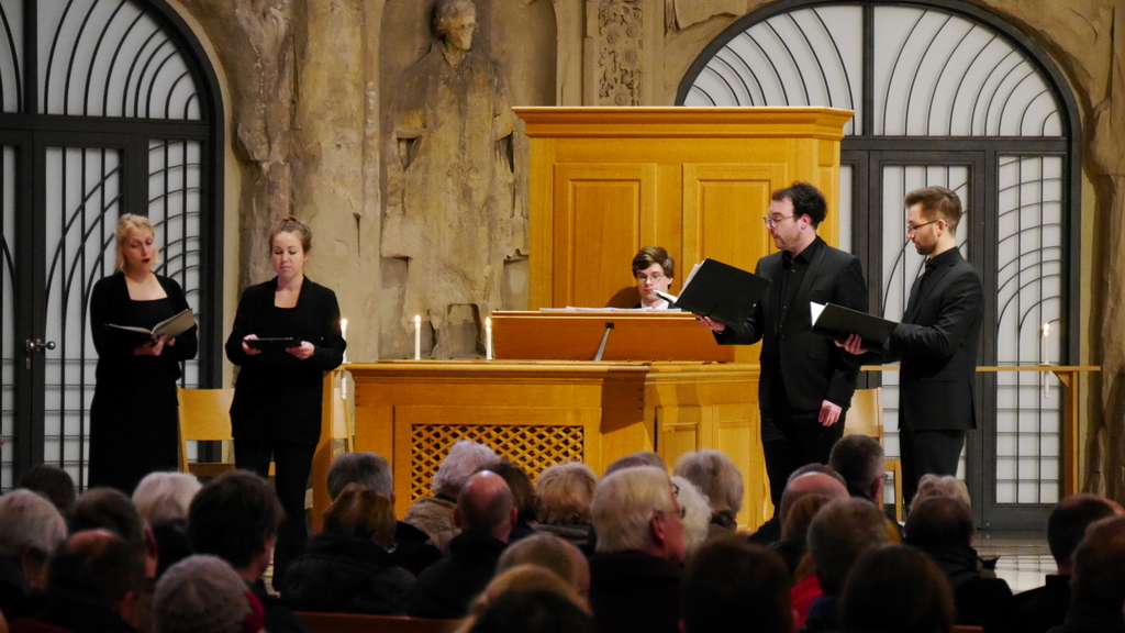 Im ersten Teil überwogen Texte, die noch der Renaissance oder dem Übergang zum Barock zugeordnet werden können, wie Alfonso Lobos »Ecce ascendimus Hierosolimam« (nach Lukas 18, 31-33, der Text »Seht wir gehen hinauf nach Jerusalem« erklang später noch im Gemeindelied EG3), Heinrich Schütz‘ »Wer will uns scheiden« (aus den Kleinen geistlichen Konzerten SWV 330), Thomas Tallis‘ »If ye love me« (»Liebt ihr mich« nach Johannes 14, 15-17) sowie besagter Heinrich Isaac (»Sei mir ein schützender Gott«). Meist a cappella vorgetragen, klangen die Stücke im großen Raum der Kreuzkirche zunächst etwas unausgewogen mit dominierendem Sopran. Mit und nach Schütz jedoch wirkte dies deutlich besser – für »Wer will uns scheiden« hatte Manuel Rotter die Continuoorgel übernommen, was sich stabilisierend auswirken sollte.