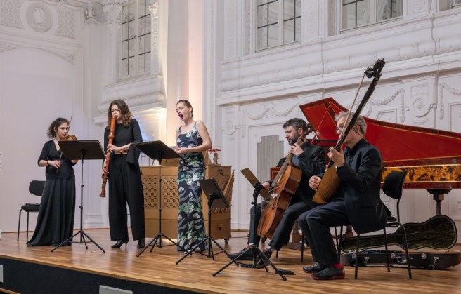Und gekonnt dargeboten, denn das Ensemble 1700, Dorothee Oberlingers eigenes Barockorchester, kann noch in kleinster Besetzung mit Einzelstimmen die schönsten (oder aufregendsten) Affekte herausputzen. Violinistin Anna Dmitrieva fand darin nicht nur zum Duett mit der Stimme oder Flöte, einen besonderen Reiz hatten die drei Damen im Trio oder fast schon Terzett, denn Gesanglichkeit ist eine Kunst, die das Ensemble 1700 noch Instrumental darstellen kann. Daher darf Vladimir Waltham (Violoncello) als wesentlicher Farbtupfer und Stütze des Basso continuo nicht vergessen werden. Axel Wolf sorgte für einen Impuls an den Zupfinstrumenten – gelassener an der Laute, fiebriger, wenn er zur Barockgitarre griff. Olga Watts wechselte für manches Adagio oder eine getragene Einleitung an die Orgel, während sie die meisten Stücke am Cembalo begleitete. Da hätte ihr Soloauftritt durchaus länger sein dürfen als ein Satz aus Christoph Graupners Partita c-Moll (GWV 131). Die Ouverture war nicht nur kurz, sie ließ auch das, was unweigerlich hätte nachfolgen sollen, missen.