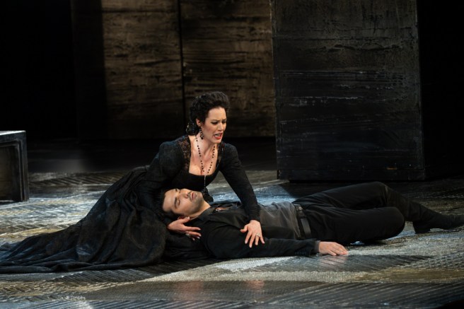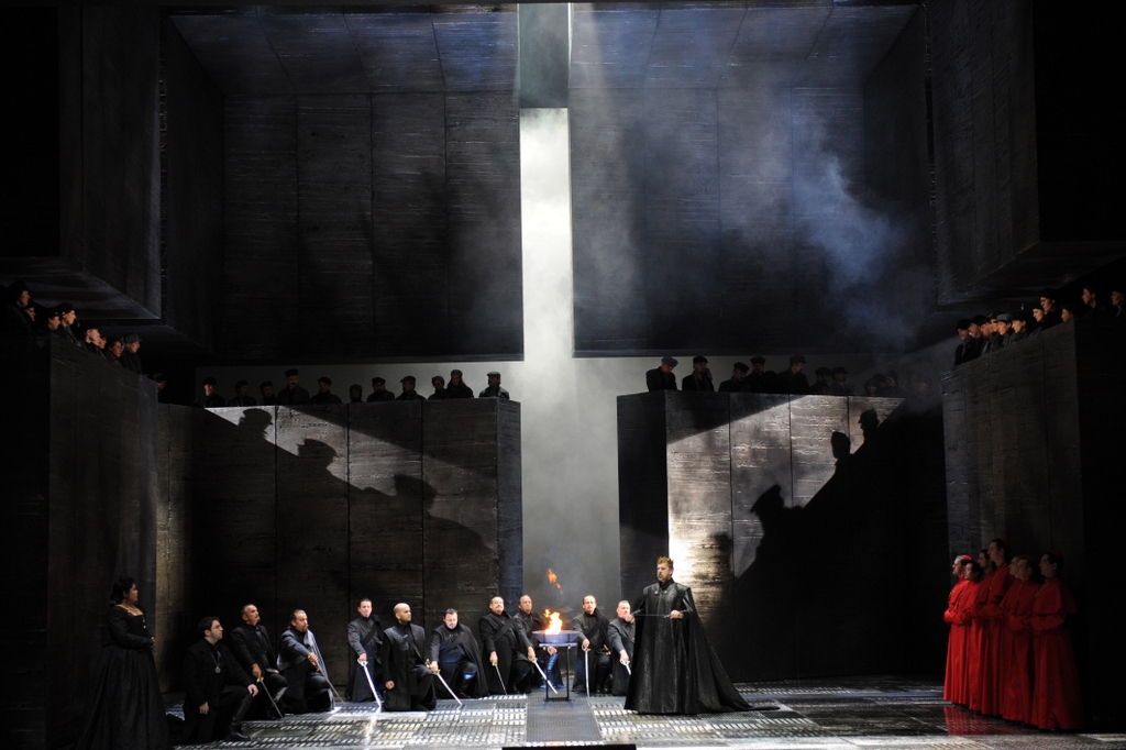 Kurz bestand am Donnerstag die Sorge, ob dieser »Don Carlo« in die Jahre gekommen sei, denn in Marco Arturo Marellis Inszenierung von Giuseppe Verdis Drama (Fassung in vier Akten) an der Deutschen Oper Berlin begannen die Kulissen beim Fahren zu quietschen. Glücklicherweise aber nur am Anfang, im weiteren Verlauf – wiewohl die Bühnenelemente fast permanent in Bewegung waren – beherrschte die Musik das Geschehen. So erwies sich das Stück unter der Federführung von GMD Sir Donald Runnicles als frisch und dramatisch, als läge die Premiere erst wenige Tage zurück (tatsächlich Oktober 2011).