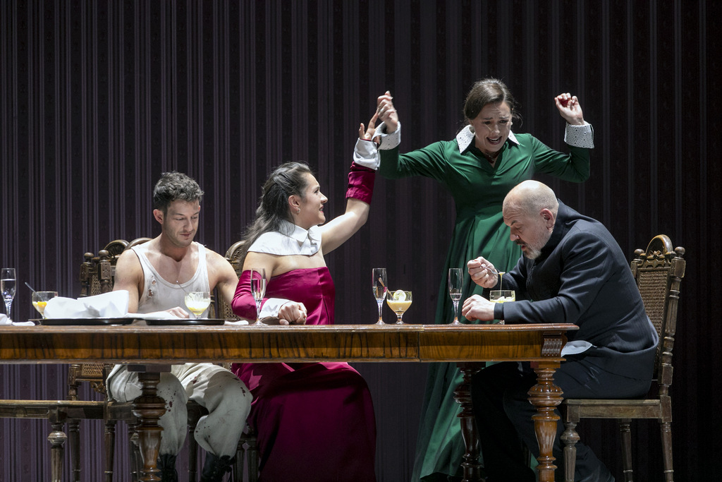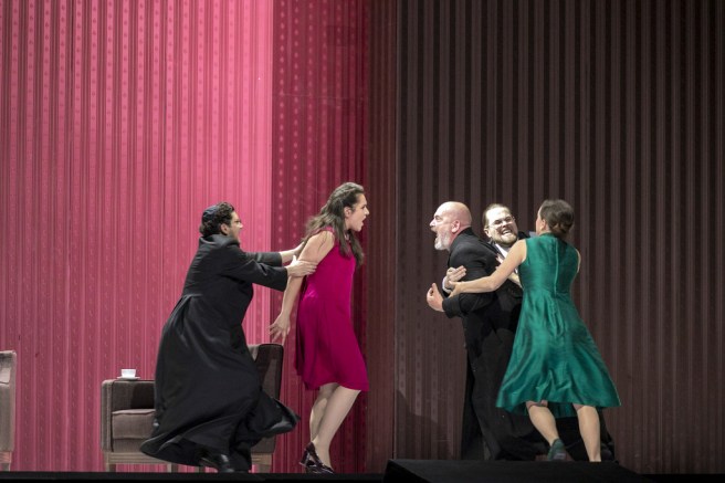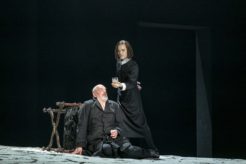 Das sparsame Spiel schafft, was die Musik an vorenthaltenen Emotionen dem Kopf überläßt darzustellen: Kippmomente, Unsicherheit, Veränderungen. Wenn die drei Geschwister Merab (Jasmin Delfs), Michal (Mary Bevan) und Jonathan (James Ley) zum Beispiel dem betörenden David zu verfallen scheinen. Die klare Zuordnung von Personen oder Wertung bricht Claus Guth immer wieder auf. So spielt Countertenor Jake Ingbar, dessen Auftritt als Hexe (Witch of Endor) im dritten Akt liegt, auch die stumme Bedienstete im Hause Sauls. David und Michal (»Flieh, fort, denn der Tod ist nahe!«) wachsen, in quasi gleicher Stimmlage, für einen Moment zu einem einig verbundenen Paar. Kurz darauf stehen sich Saul und der Prophet Samuel in Florian Boesch gegenüber wie Jekyll und Hyde.