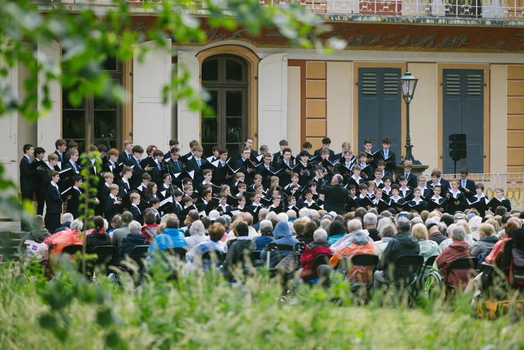 Als einen der letzten großen Gastauftritte außerhalb der Kreuzkirche vor der Sommerreise (25. bis 29. Juni) und den Sommerferien war der Kreuzchor am Pfingstsonntag wieder zur »Serenade im Grünen« bei den Dresdner Musikfestspielen in den Schloßpark Pillnitz eingeladen. Hatte noch vor Jahresfrist an gleicher Stelle ein nahendes Gewitter zunächst die Stimmung bedenklich werden lassen und den Abschluß leicht verkürzt, konnten die Kruzianer diesmal erleichtert feststellen, daß sich Wolkenbrüche frühzeitig ausgetobt hatten und bis auf ein paar vereinzelte Regentropfen und rauschende Blätter – was im Grunde der romantischen Atmosphäre entsprach – keine Unbilden das Konzert beeinträchtigten.