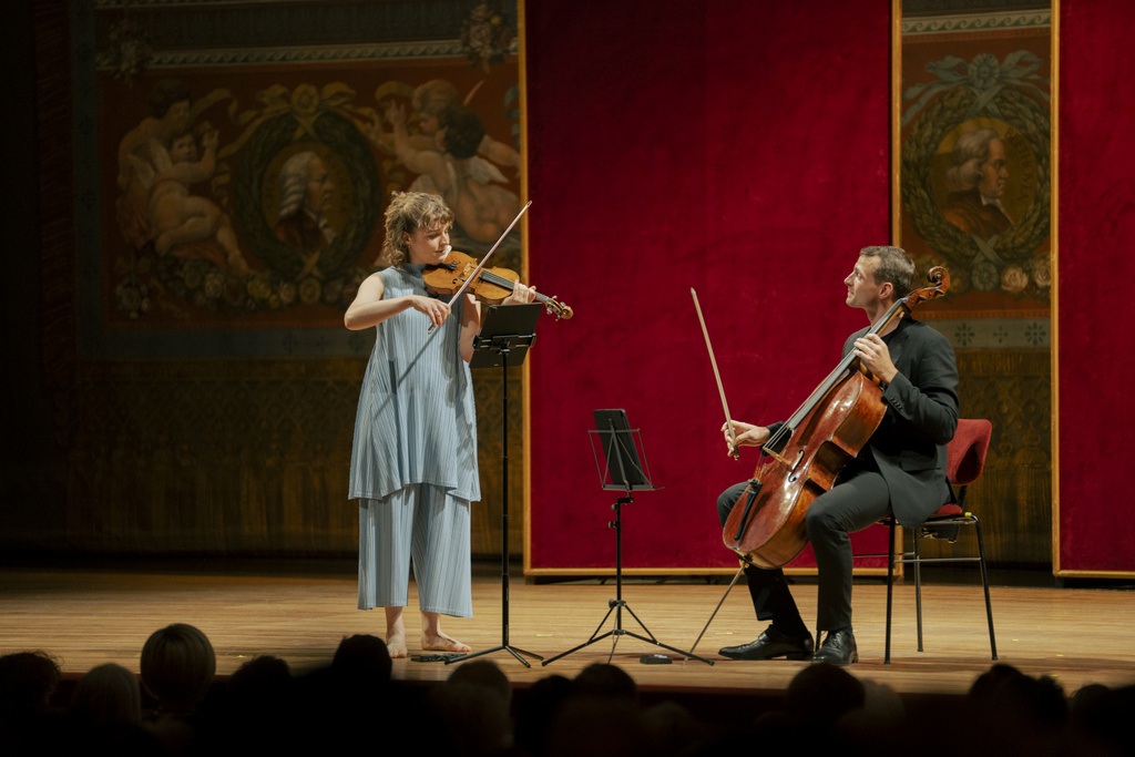 Zu Beginn durften Charlotte (Violine) und Friedrich Thiele (Violoncello) noch einmal vorführen, wie innig der kammermusikalische Austausch von Geschwistern sein kann. Mit Erwin Schulhoffs Duo für Violine und Violoncello gab es einen vorläufigen Abschluß – Friedrich Thiele ist seit 2021 als 1. Konzertmeister Violoncello fest mit dem Orchester verbunden, seine Schwester war es seit der letzten Saison als Akademistin mit Konzertmeisterdiensten auf Zeit. Als Duo treten beide nach wie vor auf und zeigten, wie bei Schulhoff, der eine Zeitlang in Dresden gelebt hat, wie Stimmen miteinander verbunden sind, noch dann, wenn sie teilweise zwar nicht unabhängig, aber eigenständig scheinen – wie Tänzer, die sich nicht berühren und ihre Pirouetten mit einem Abstand vollführen. Im zweiten Satz (Zingaresca. Allegro giocoso) offenbarte vor allem Charlotte Thiele ein feuriges Temperament der Violine, beide imitierten mit verfremdenden Effekten die volkstümlichen oder Balkanklänge bis hin zur Fidel eines Spielmannes (bzw. einer Spielfrau). Das Andantino sorgte als Nachtstück mit Motivverflechtungen für Beruhigung, bevor das Finale Presto fanatico einem wilden Tanz folgte – blitzsauber und virtuos dargestellt.