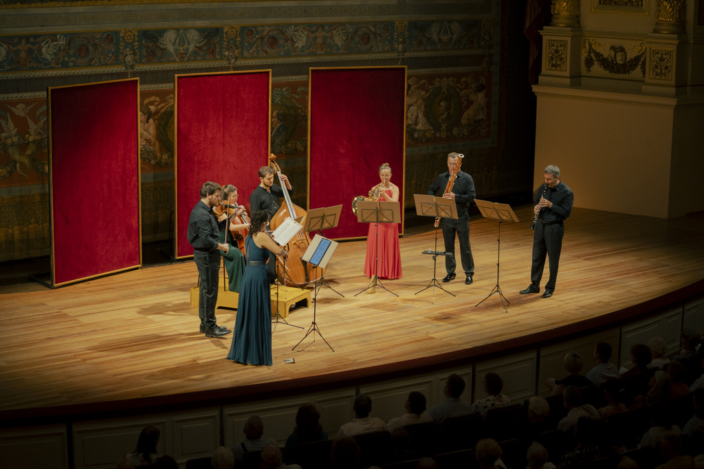 Den jazzigen Einstieg bzw. dessen groovigen Sound und Rhythmus gaben zunächst Marie-Luise Kahle (Horn) und Henning Stangl (Kontrabaß) vor, bevor die Melodie durch alle Stimmen weitergegeben und -entwickelt wurde. Ohne Zweifel dürfte dieser Reigen auch den Spielern (außerdem Yuki Manuela Janke / Violine, Marcello Enna / Viola, Catarina Koppitz / Violoncello, Jan Seifert / Klarinette und Hannes Schirlitz / Fagott) Spaß gemacht haben. Dabei war die Musik zum Ausklang keineswegs ohne Anspruch. Auf eine flotte Tarantella (dritter Satz) folgte mit dem Adagio appassionato das romantischste Stück, zumindest die teilweise gedämpften Bläser und die Hornstimme folgte dem Gestus einer Romanze, während hier und da Verzierungen und Glissandi die Modernität des Stückes verrieten. Der Satz klang in zauberischem Funkeln aus. Mit dem Vivace con brio schlug Saglietti einen Bogen zum Anfang.