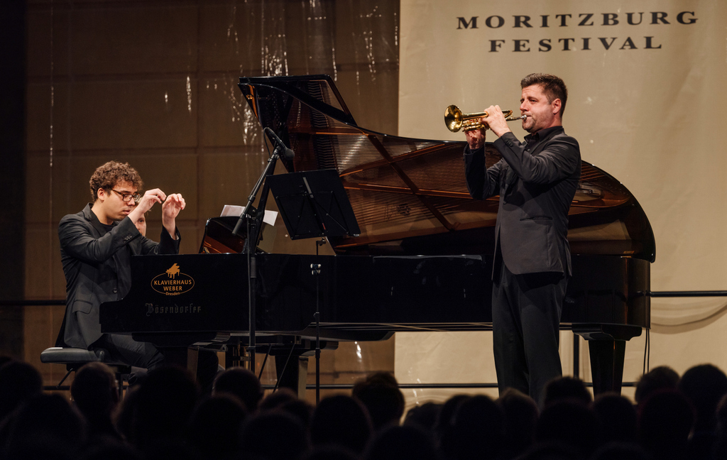 Nach deren krankheitsbedingter Absage übernahm wieder Helmut Fuchs die Interpretation auf der Trompete, am Klavier begleitete ihn Anton Mejias. Mit seinem weichen Ansatz ersetzte Helmut Fuchs die an dieser Stelle eigentlich vorgesehene Sopranistin stimmlich wunderbar – in den nun zu Liedern ohne Worte gewordenen Stücken mochte man gern den Inhalt der Texte erraten. Aber es gab ja auch schon Sängerinnen in Moritzburg – vielleicht wird in einem der nächsten Jahrgänge eine Sängerin einen noch größeren Reiz entfalten, wenn sie von »Sonne und Liebe«, »Urania« und »anderen Liebesgeschichten« erzählt?