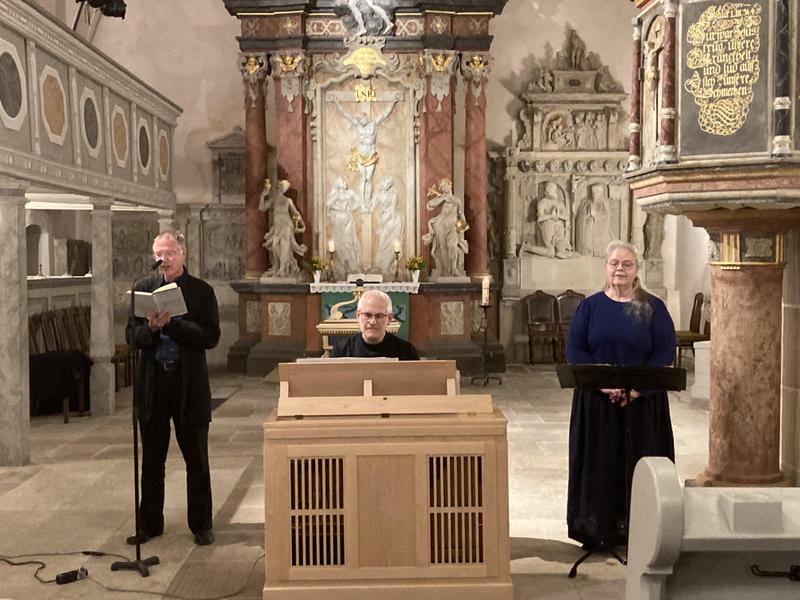 »Ins Innere hinaus« hieß das Konzert am Dienstagabend in der Kirche Altleubnitz, das mehr als nur »Musik und Texte« wie versprochen enthielt, sondern sich als durchkomponierter Konzeptabend erwies. Jan Katzschke (Orgel) und Dorothea Zimmermann (Gesang) musizierten gemeinsam Musik aus dem 17. Jahrhundert, Christian Lehnert las dazu aus seinem 2020 erschienen Buch »Ins Innere hinaus« (Suhrkamp). Es erzählt von Begegnungen, Momenten, von Engeln und Mächten und sollte manche Brücke zu den gesungenen Texten offenbaren, die in den Fassungen von Heinrich Schütz, Andreas Hammerschmidt und Matthias Weckmann zu Gehör gebracht wurden.