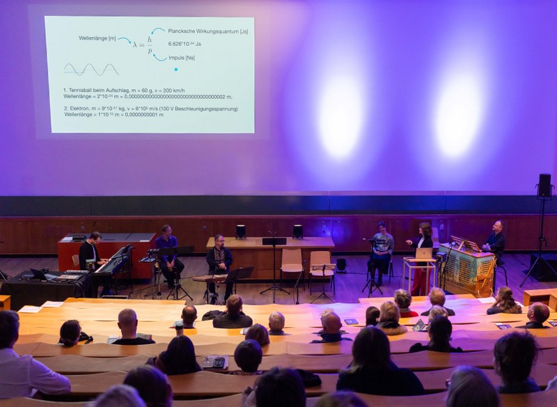 Solche Spannungen fehlten im Heinz-Schönfeld-Hörsaal, auch gelang es Elena Hassinger leider nicht, wirkliche Impulse zu setzen. Ihr sehr schlichter, aber etwas holpriger Einstieg in die Quantenphysik in fünf Abschnitten eines Vortrags ließ die Möglichkeiten, einen Impuls zwischen Physik und Musik weiterzugeben, mit Ausnahme der Frequenzen beim Stimmen einer Lautensaite, fast aus.