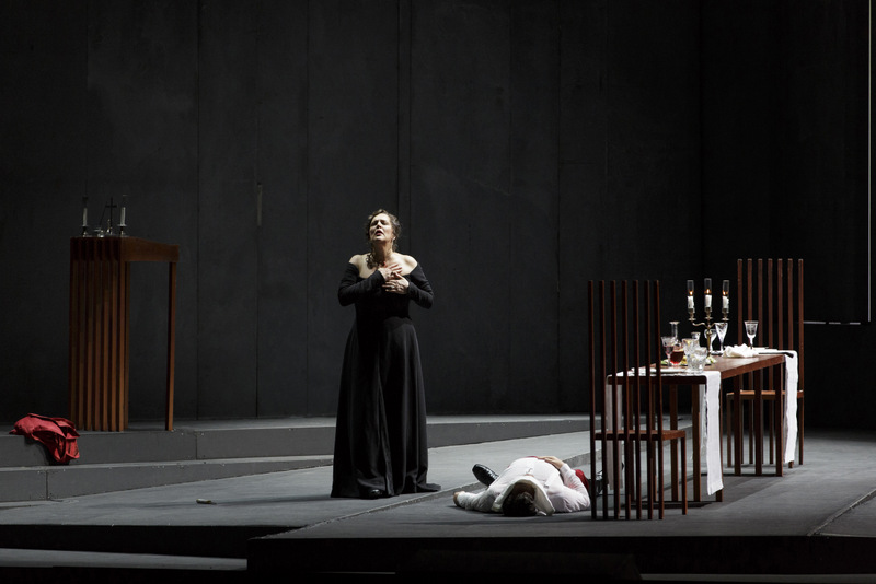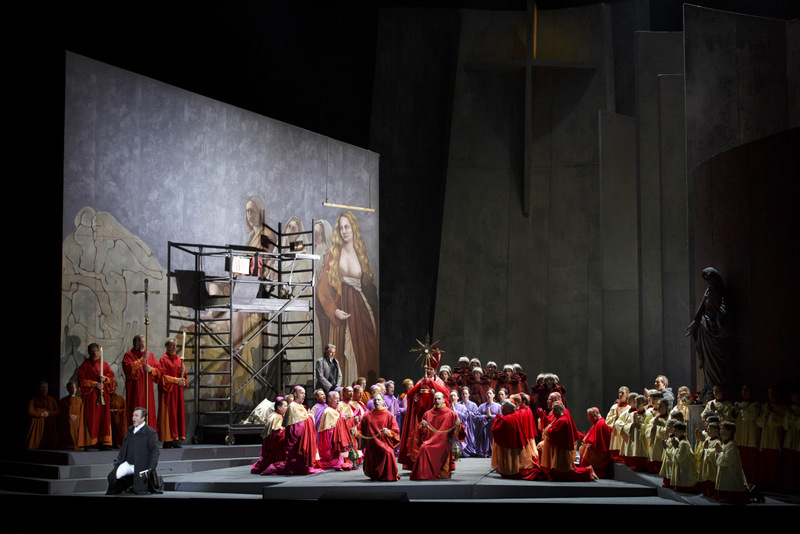Cavaradossi und Tosca konnte dies freilich nicht mehr helfen. Ebensowenig das wunderbare Hirtensolo (Kapellknabe Maximilian Wiederhold), das nur den Tod ankündigte. Allerdings war Scarpia da bereits verloren, weil ihn Tosca erdolcht hatte. Oleksandr Pushniak, bereits in der letzten Spielzeit als Scarpia besetzt, gewann im zweiten Akt, ganz in Rot gekleidet, an Überzeugungskraft. Zu Beginn, noch mit leiseren Tönen, mangelte es ihm an der Gefährlichkeit eines Polizeichefs. Dagegen spielte Markus Marquardt als Mesner seine ganze darstellerische Erfahrung aus, die mit einer winzigen Geste oder einem einzelnen Ton Präsenz schafft – »Fuori, Satana, fuori!« (»Weiche, Satan, weiche!«) war nicht einfach gesagt oder gesungen, sondern barg ein höllisches Fauchen auf »Satana«!