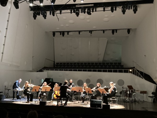 Die eingebundenen Reproduktionen erinnerten Jörn-Peter Hiekel an die Aufnahmen Béla Bartóks, der einst volkstümliche Musik aufgezeichnet hatte. In »still listening II« (weiterhin zuhören) waren solche volkstümlichen Klänge oder Countrymusik der kanadischen Heimat (?) nicht nur eingebunden, sie wurden Teil einer lebhaften Interaktion. Mit der Komponistin (Stimme und Banjo) und den Turntable-Plattenspielern für den »gescratchten« Sound unter der sorgsamen Leitung von Nicolas Kuhn, der schon das erste Stück dirigiert hatte, entstanden nicht nur mannigfaltige Eindrücke eines Klangerlebnisses, sondern wurden Szenen wie ein Film, der angehalten wird, oder ein rückwärtslaufendes Tonband suggeriert.