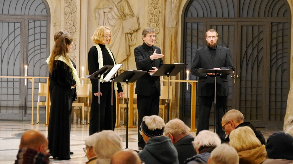 Regelmäßige Besucher der Dresdner Kreuzkirche kennen das Ensemble VokalChoral von Marcus Steven seit langem, spätestens seit ihrer Beteiligung an den Striezelmarktmusiken der letzten Jahre. Neben dem Leiter, der den Baß übernimmt, singen darin Lara Hölzel und Gertrud Günther (Sopran), Aenne Stauner (Alt) sowie Stephan Keucher (Tenor). In der Vesper vor dem Ewigkeitssonntag präsentierten sie ein großes Programm, das durch die einzeln besetzten Stimmen eine besondere Klarheit erfuhr.